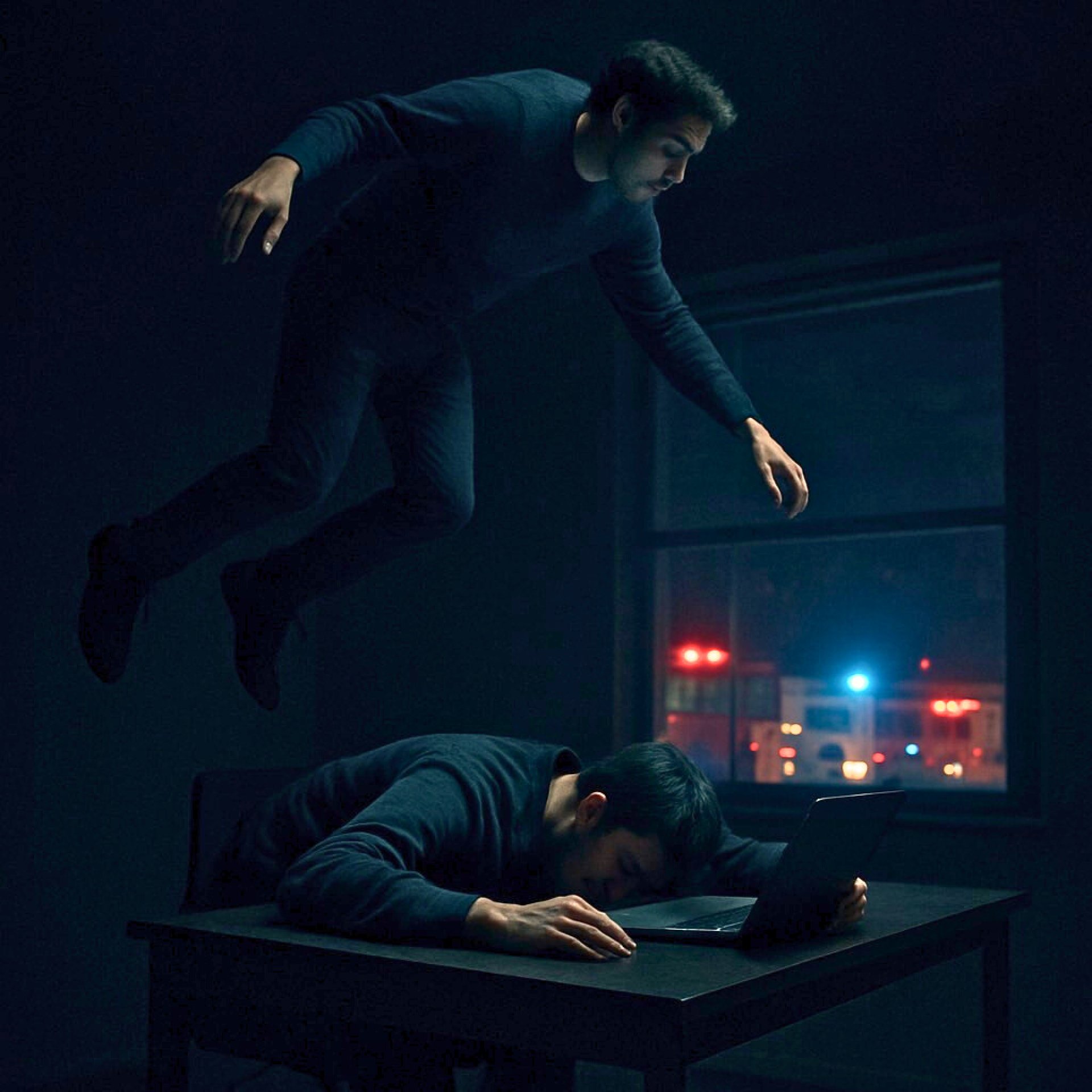 ร่างกายของผมลอยเคว้งคว้างอยู่ในความมืดที่ไร้ซึ่งจุดหมาย ผมมองเห็นร่างกายตัวเองนอนคว่ำหน้าอยู่บนโต๊ะทำงาน ในมือถือแล็บท็อปที่ปิดสนิท แสงจากหน้าจอที่เคยส่องสว่างกลับกลายเป็นความมืดที่ไร้ซึ่งชีวิตชีวา แสงไฟในห้องดับสนิท ทำให้ผมมองเห็นภาพตัวเองไม่ชัดเจนนัก ผมมองเห็นร่างนั้นอยู่นานแค่ไหนไม่รู้ เพราะผมไม่สามารถจับต้องเวลาได้อีกแล้ว