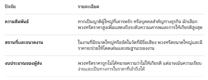 การจะเลือกพวงหรีดราคาถูกหรือแพง มักขึ้นอยู่กับปัจจัยหลัก 3 ประการ: