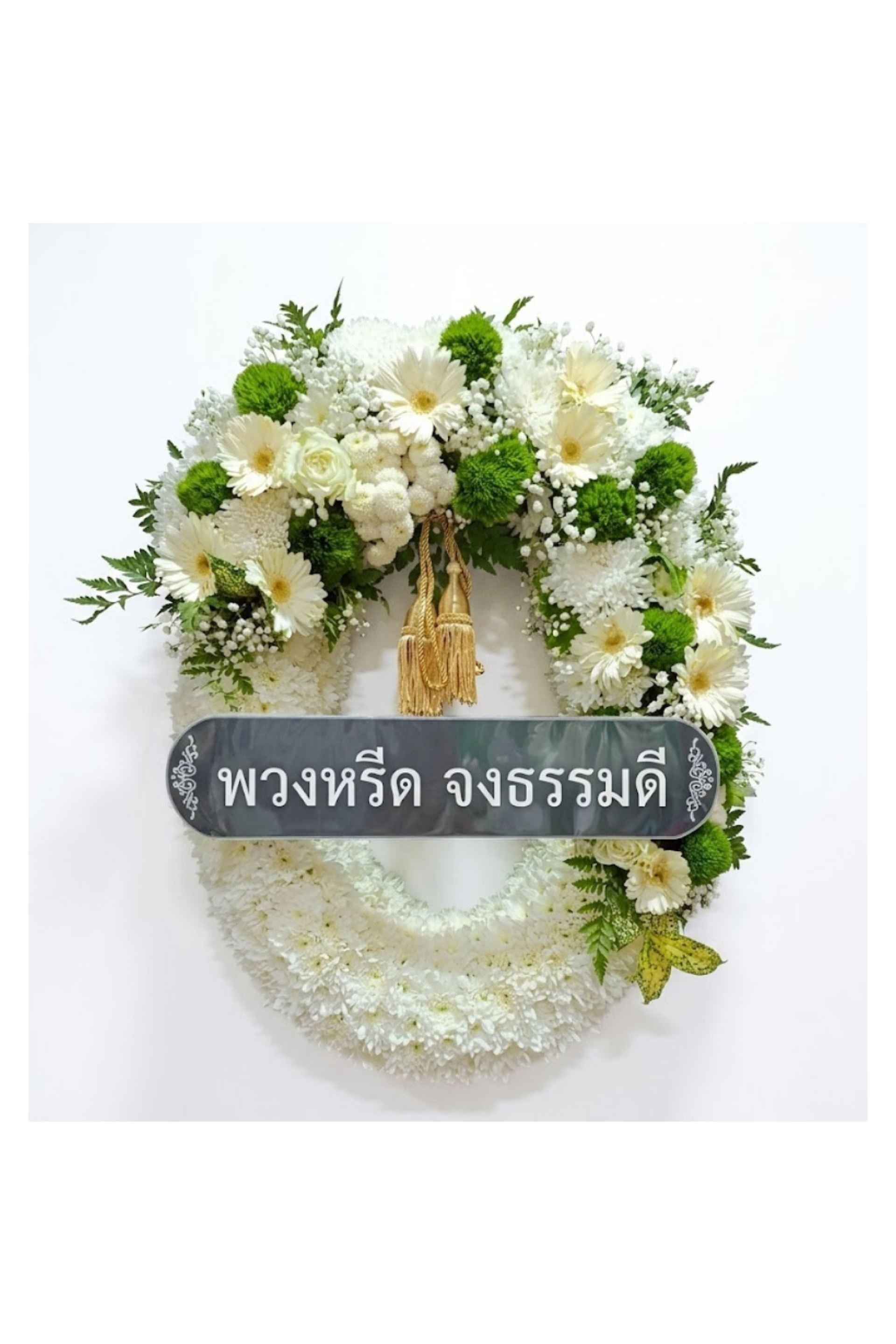 พวงหรีดในรูปตัวอย่างเป็นพวงหรีดดอกไม้สดที่เน้นความประณีตสูง มีการผสมผสานระหว่างดอก เยอบีร่า (Gerbera) และ มัม (Mum) ในโทนขาวเขียว ประดับด้วยพู่สีทองซึ่งช่วยยกระดับความหรูหรา แสดงถึงความอาลัยอย่างมีระดับและมีความเป็นทางการสูงครับ