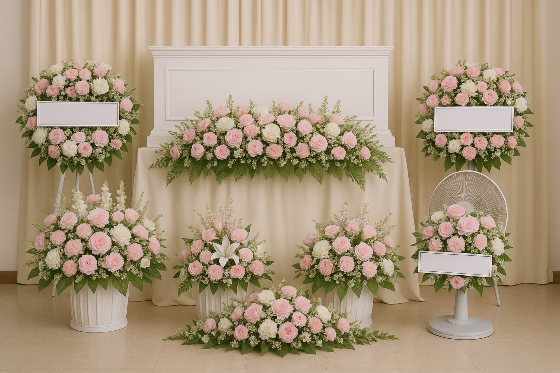 ใช้จัดบริเวณหน้าโลงศพหรือเวทีพิธี มักใช้ดอกไม้สีสุภาพ เช่น ขาว ชมพูอ่อน เหลือง หรือม่วงอ่อน เพื่อสร้างบรรยากาศสงบ เรียบร้อย และให้เกียรติผู้ล่วงลับ